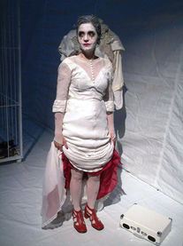 Figurinos: Telumi Hellen Autora: Angélica Liddell Tradução: Aimar Labaki Direção: Reginaldo Nascimento Elenco: Alessandro Hernandez e Amália Pereira Cenografia: Reginaldo Nascimento Iluminação: Vanderlei Conte Cenotécnico: Fábio Jerônimo Costureira: Elisângela Dally e equipe Bordados: Sueliton E. Martins Sonoplastia: Reginaldo Nascimento Operação de som: Francisco Cruz Operação de luz: Teatro Kaus Assistentes de produção: Francisco Cruz, Joca Sanches, Reinaldo Fonseca, Simone Cardozo Treinamento de Bufão: Roberta Calza Fotos do Programa: Francisco Cruz Fotos: Fabíola Galvão Assessoria de Imprensa: Amália Pereira Produção Executiva: Alessandro Hernandez, Amália Pereira e Reginaldo Nascimento Realização: Teatro Kaus Cia Experimental Fotos: Fabíola Galvão e Francisco Cruz UM FIGURINO PARA HYSTÉRICA PASSIO - Telumi Hellen Um convite... Do Teatro Kaus Cia Experimental Abriu-se-me um espaço para adentrar e digerir o universo provocativo e transgressor da artista Angélica Liddell, cuja dramaturgia fomenta a nossa emoção visceral, sanguínea, das arestas obscuras e negras do ser humano, como a morte, o sexo, a violência, o poder e as loucuras, que se entrelaçam, gerando narrativas, e a poesia da violência visual em cena. A proposição do espaço cênico criada pelo diretor Reginaldo Nascimento traz a leitura de um manicômio, com uma jaula, um figurino suspenso, um manequim com figurino, uma vitrola e uma bicicleta infantil, em branco e pequenos pontos vermelhos. Foi um apontamento da linguagem que estava sendo pesquisada, que desencadeou a viagem do processo dos figurinos, juntamente com os experimentos e improvisações de clow terror, propostas pelos atores como os personagens Hipólito (filho) e Thora (mãe). Fomos gerando e fundindo a estatueta no espaço cênico, na encenação, com plasticidade das memórias como camadas de afeto nas estatuetas, sobreposições de tons de branco. O figurino suspenso de Senderovich, o pai inexistente, em uma dimensão agigantada, como marionete, é usada em momentos de loucura, autoridade, poder, acolhimento. No figurino do manequim temos um instante lúdico desse pai, alegórico e também temos o pai boneco, todos manipulados pelo filho Hipólito. As memórias das camadas que vêm formando os figurinos, trazem à tona uma carga do passado, com a fúria da encenação: o branco explícito, redundante em toda parte, desde o pai dentista Sendenovich, à mãe enfermeira Thora, que vive em conflito com o seu filho Hipólito, cria desse casal. Voam como mariposas brancas na cegueira, em busca de luz. O vermelho pinta as cenas progressivamente desvendando a dor, a explosão em cena, como gotas de sangue de petiscos de rosas, uma saia que se transforma em uma vulva, que engole, vomita e dança. Tragicômico, um mundo perverso na brancura de várias toneladas, onde tudo sangra. Como a violação da carne que reverbera no corpo e deixa marcas nele. Esse lugar foi impresso nos figurinos: o desconhecido, o amálgama, as sobreposições que se encontram já impressos em nossa vivência, gerando conflitos que renascem no aqui/agora. Um lugar desgastado, sórdido e mórbido em nossa memória. Com a força da interpretação de Alessandro Hernandez e Amália Pereira, o figurino transborda em cena, maquiando todo o cenário em conflito poético.